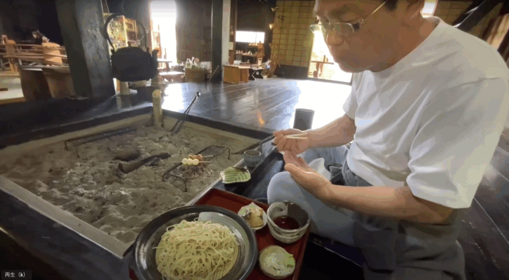 お蕎麦と一緒に名物の「焼き団子」を注文しましたので、囲炉裏の方に移動しました。